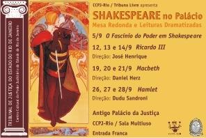 CCPJ-Rio / Tribuna Livre: Shakespeare no Palácio. 5/9 - Mesa Redonda: "O fascínio do poder em Shakespeare" com Daniel Herz, Dudu Sandroni e José Henrique. Leituras Dramatizadas: 12, 13 e 14, "Ricardo III", direção José Henrique; 19, 20 e 21, "Macbeth", direção Daniel Herz; 26, 27 e 28, "Hamlet", direção Dudu Sandroni. Sempre às 19h, na Sala Multiuso do CCPJ-Rio; a entrada é franca e aberta ao público em geral. As senhas serão distribuídas às 18h, no local; a sala tem lotação de 70 lugares. Antigo Palácio da Justiça - Rua Dom Manuel, 29, térreo. Centro. Rio - RJ. Mais informações: 3133-3366 / 3133-3368; ccpjrio@tjrj.jus.br.