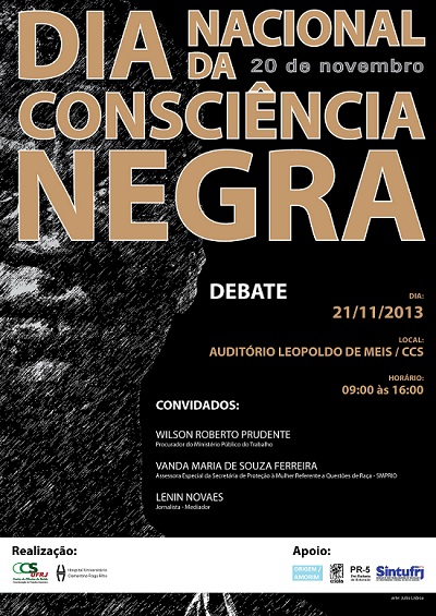 Na quinta-feira, 21 de novembro, o Centro de Ciências da Saúde – CCS – vai celebrar o Dia Nacional da Consciência Negra, oficialmente comemorado em 20/11. Dentre as atividades, debate com Wilson Roberto Prudente, procurador do Ministério do Trabalho e pesquisador-colaborador do Núcleo Brasileiro Latino Americano e Caribenho de Pesquisas em Gênero, Raça e Movimentos Sociais, ligado à Universidade Federal do Ceará; e Vanda Maria de Souza Ferreira, pedagoga e assessora especial da Secretaria de Proteção a Mulher, referente a Questões de Gênero e Raça, das 9:30 às 11:30 horas, no Auditório Leopoldo de Meis. Confira a programação.