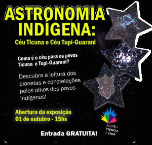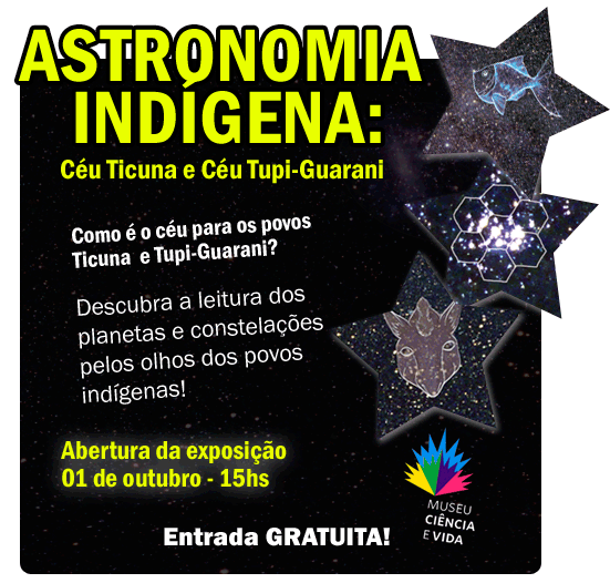 Dia 01 de outubro, às 15h, vamos abrir uma exposição sobre a astronomia indígena, mostrando a ciência e a cultura dos povos Ticuna e Tupi-Guarani de acordo com a iconografia de seus céus. Além de mostrar a criatividade relacionada com ciência, é uma ótima oportunidade de ofertar aos alunos uma interessante experiência. Estamos oferecendo, logo após a exposição, uma sessão de planetário focada na astronomia indígena! É uma experiência diferente e enriquecedora, valorizando a nossa diversidade cultural.